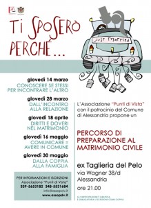 In questa direzione l’Associazione “Punti di Vista” ha pensato di organizzare un Percorso di preparazione al matrimonio civile rivolto alle coppie che intendono sposarsi con rito civile, ma anche a coppie già sposate che siano interessate ad approfondire alcuni aspetti psicologici e legali della loro “scelta relazionale”.